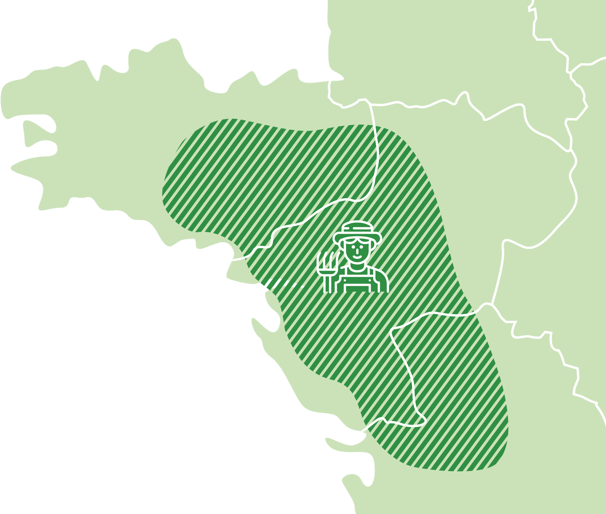 Nous travaillons avec 122 éleveurs et éleveuses de volailles biologiques, installés dans l’Ouest de la France. Cette activité au cœur des terroirs de l’ouest reflète notre volonté de soutenir un développement local : elle facilite les échanges, permet un suivi attentif des élevages et réduit les distances de transport, un bénéfice concret pour le bien-être animal comme pour l’environnement.