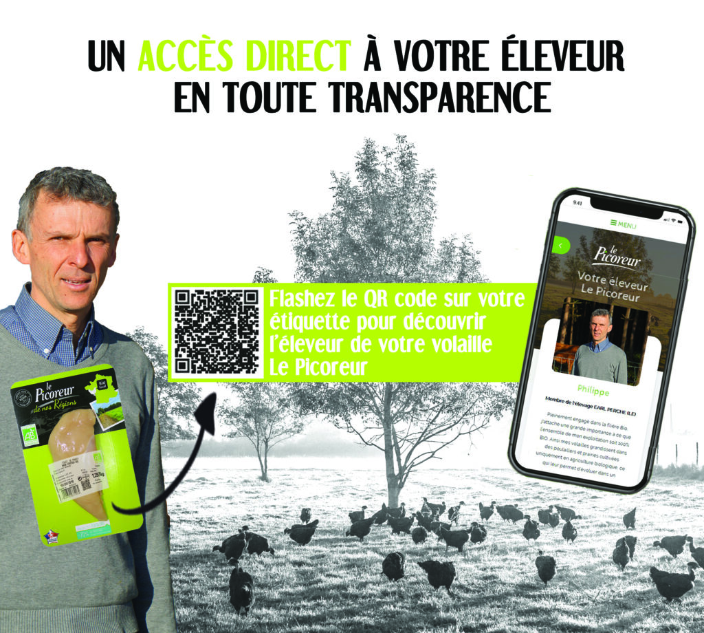 Depuis le 15 mai 2019, les consommateurs Le Picoreur en magasin Bio peuvent découvrir la ferme d’origine de leur volaille fraîche en scannant simplement le QR code du ticket poids-prix !