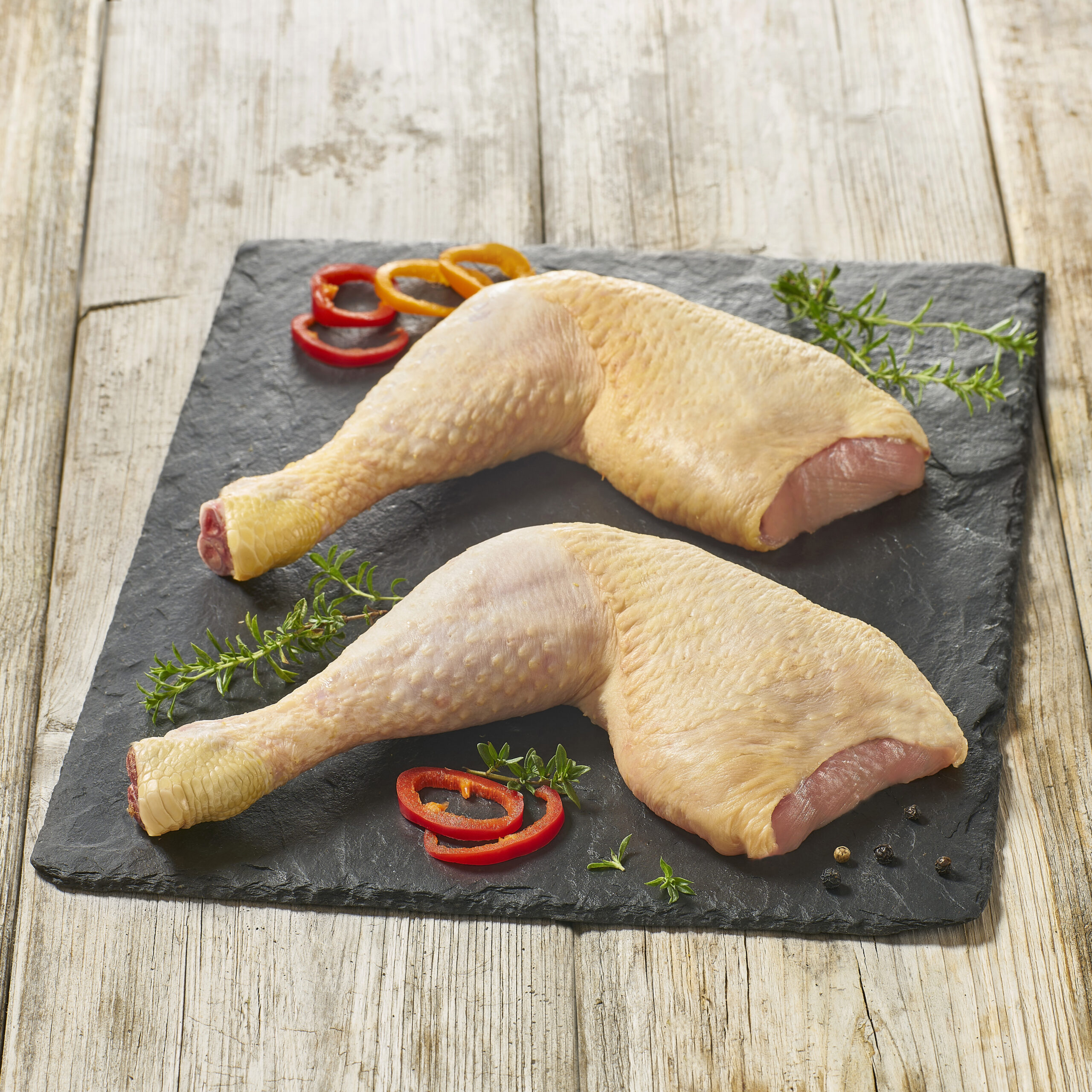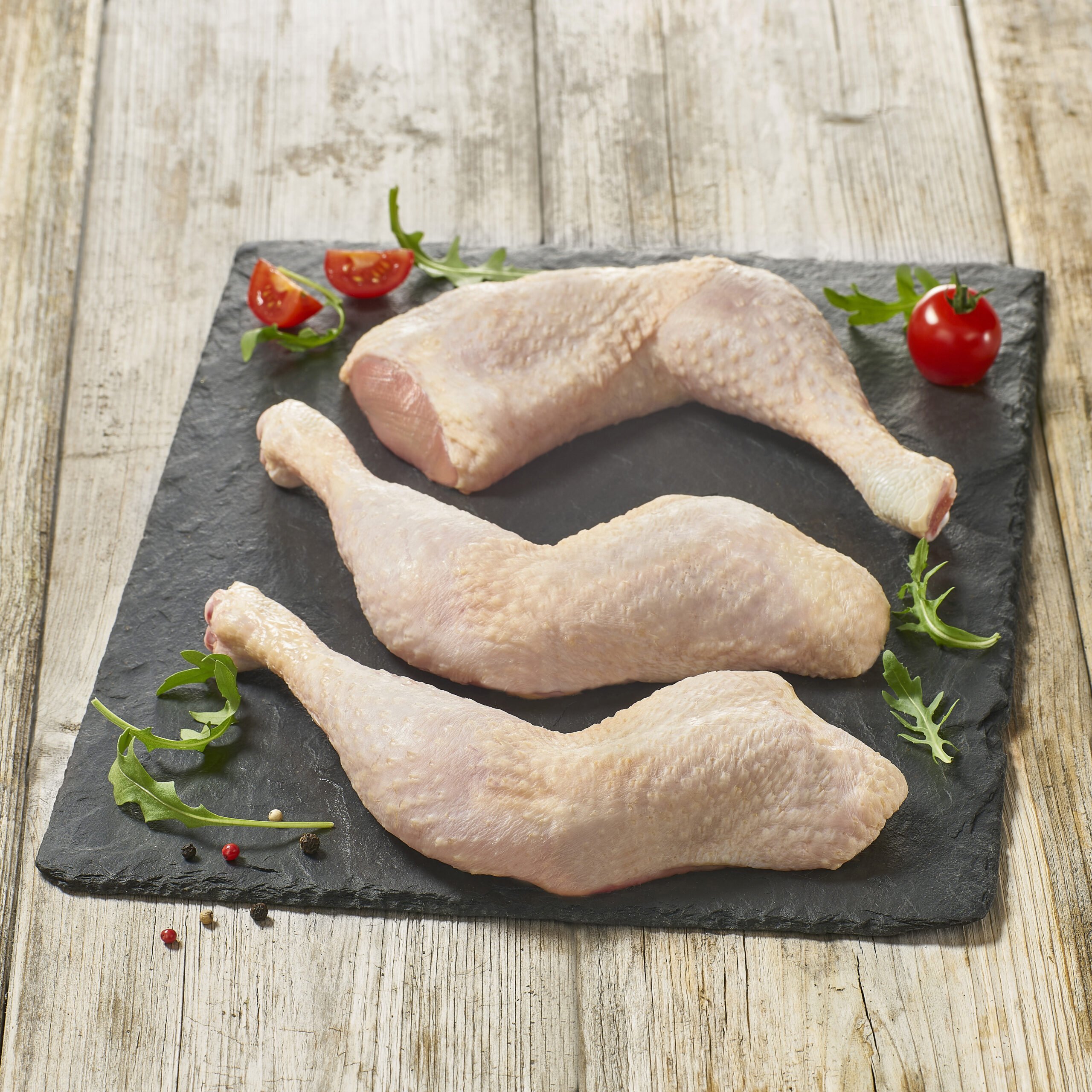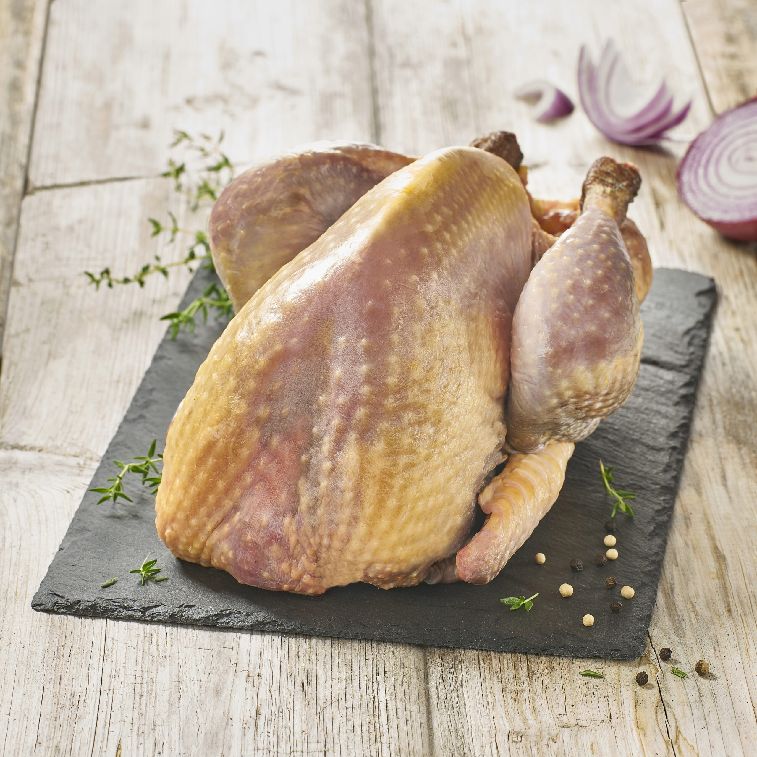 Nos volailles sont élevées en plein air, nourries avec une alimentation biologique à base de céréales et de protéines végétales, sans OGM (<0,9 %), dans le respect du bien-être animal.